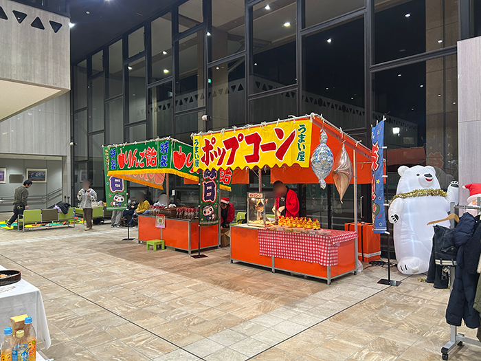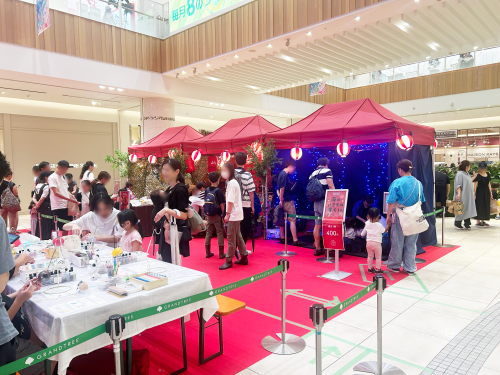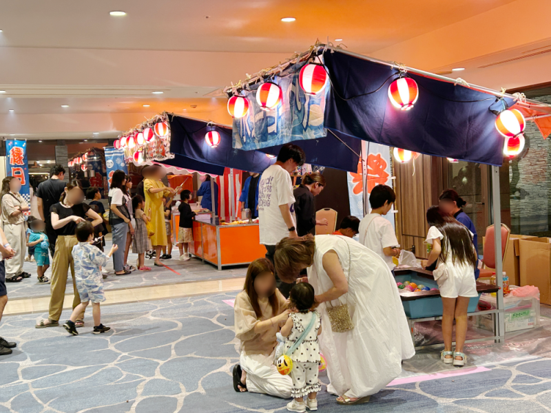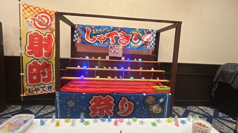 射的・手裏剣をはじめ縁日フード・三寸屋台にやぐら提灯を組み合わせ、非日常のお祭り空間を実現します。