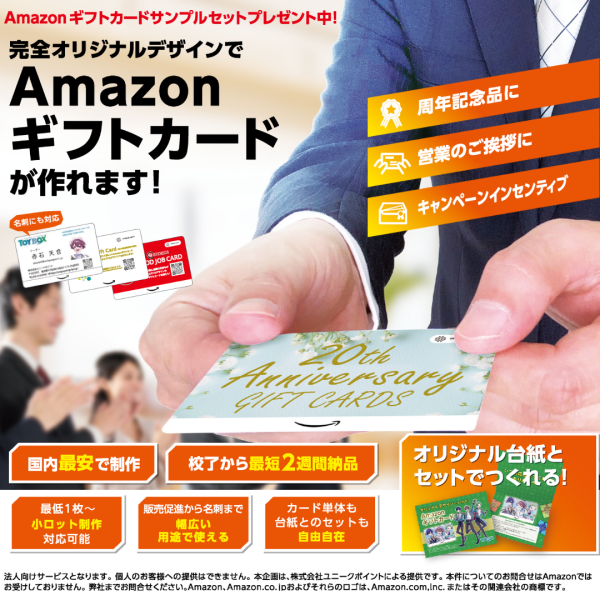Amazonギフトカードのサンプルセットのお取り寄せ大歓迎です!オリジナルデザインのAmazonギフトカードならユニークポイントにお任せください!